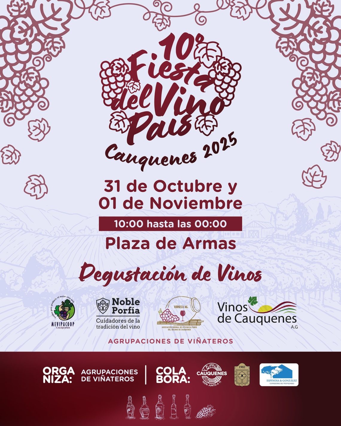 Los días 31 de octubre y 1 de noviembre, la Plaza de Armas de Cauquenes será el punto de encuentro para viticultores, turistas y amantes del vino que llegarán a disfrutar de la 10ª Fiesta del Vino País, una de las celebraciones más tradicionales del Maule.